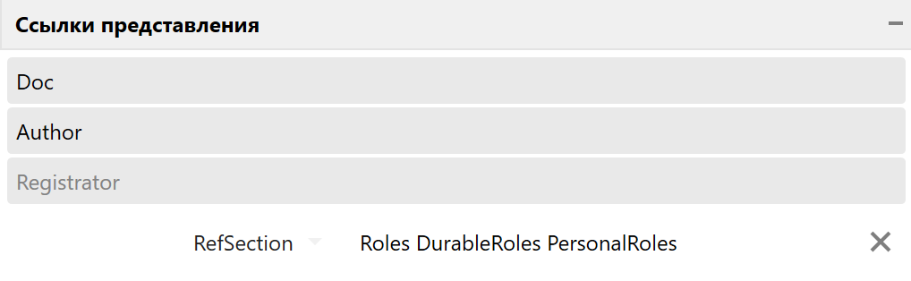В данном блоке отображаются все ссылки текущего выбранного представления. Для каждой ссылки представления можно переопределить её RefSection. Чтобы это сделать необходимо нажать на ссылку, для которой нужно задать RefSection, и в появившейся строке настройки RefSection указать требуемое значение. В данном поле можно задать несколько RefSection, разделяя каждое пробелом.