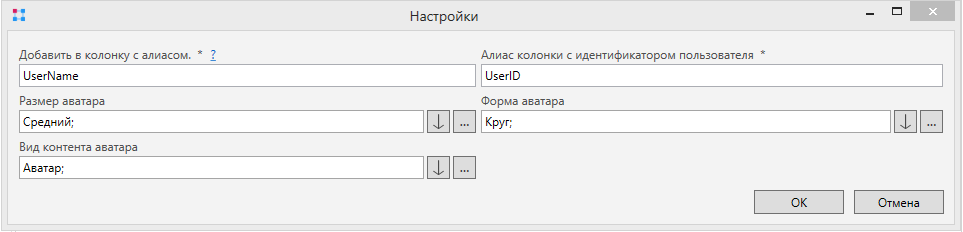 - Алиас колонки с идентификатором пользователя - алиас колонки, в которой указан идентификатор пользователя, чей аватар нужно добавить. Колонка может быть скрыта.