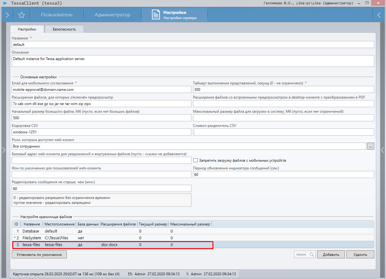 docилиdocx, прикладываемые к карточкам документов, будут сохраняться в хранилищеtessa-files, а все остальные - в основном файловом хранилищеFileSystem.Note
