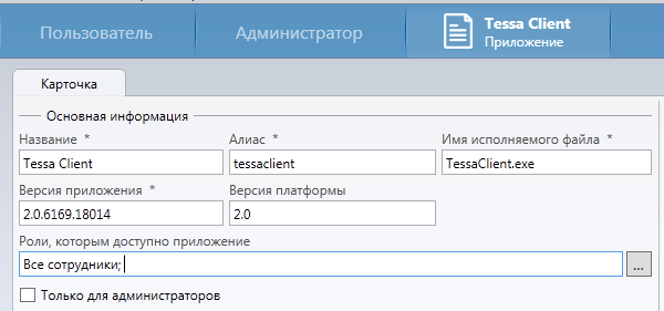 логин/парольможно указать учетные данные для запуска приложений не под текущим пользователем, а под каким-либо другим (зарегистрированном в справочнике сотрудников TESSA), например, логин:admin, пароль:admin- стандартные учетные данные для первого запуска приложения. -
