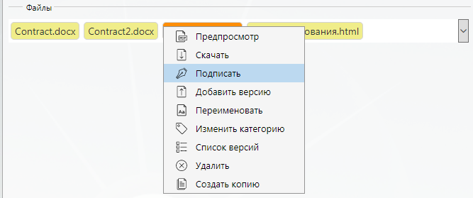 После выполнения указанных выше настроек в web-клиенте в карточке документа для приложенных файлов появится пункт меню “Подписать”: