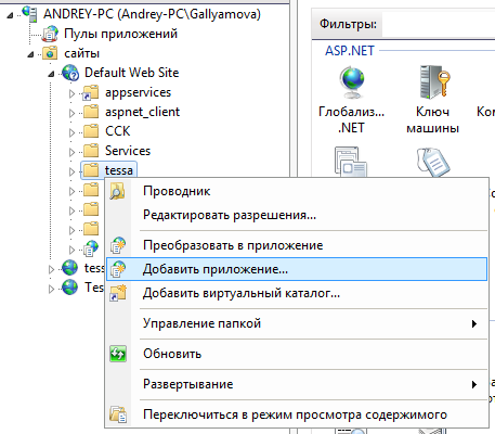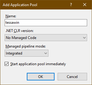 В IIS создать пул приложений (в этом примере с именем “tessawin”) с параметрами, аналогичными основному пулу приложений (указать “Без управляемого кода” в выпадающем списке)