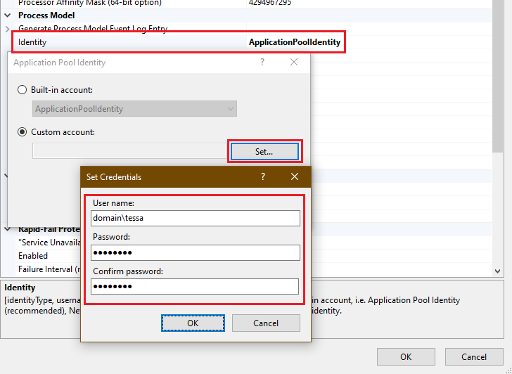 Выбрать созданный пул, нажать пункт “Дополнительные параметры” в контекстном меню, и указать ту же учётную запись, которая указывалась для основного пула. Если в настройках основного пула указана встроенная учётная запись