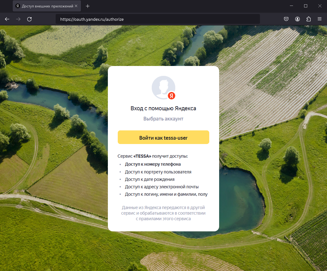 При выборе одного из провайдеров, например, Yandex будет произведено перенаправление на страницу провайдера для прохождения аутентификации во внешнем сервисе. Например, может быть отображено окно для выбора учётной записи и ввода логина и пароля: