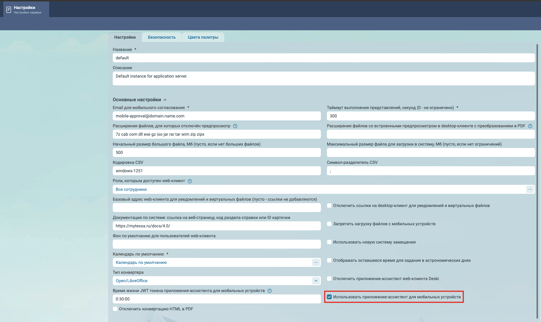 Если кнопка "Использовать приложение-ассистент для мобильных устройств" заблокирована, то необходимо перепроверить наличие лицензии на модуль "Приложение-ассистент для мобильных устройств".