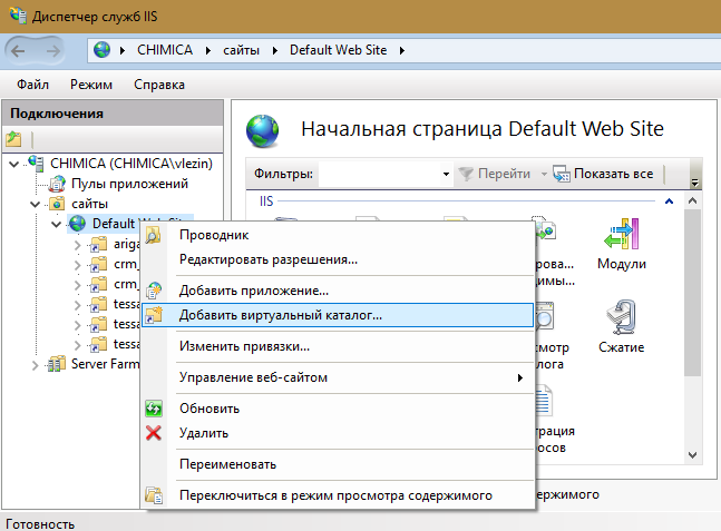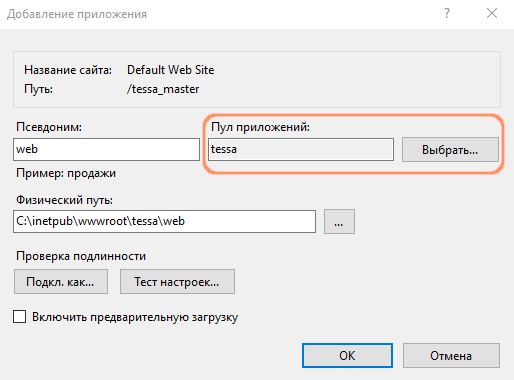 Default Web Siteи вложенная в него папкаtessa\web. Папку необходимо преобразовать в приложение через контекстное меню и указать в настройках созданный ранее пул приложений (для примера -tessa):