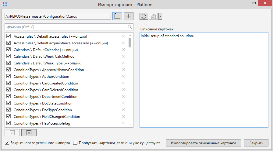 и указать путь к библиотеке карточек из сборки Configuration\Cards\Platform.jcardlib. В окне импорта появятся карточки из выбранной библиотеки.