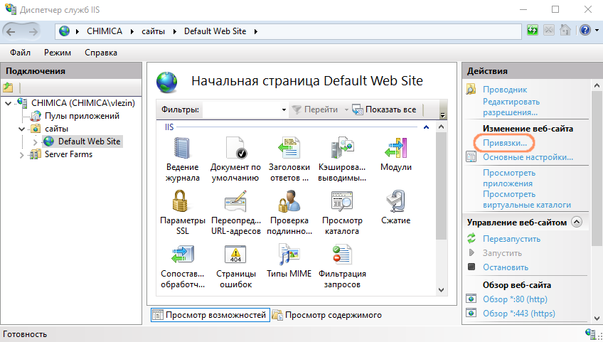 Для этого в консоли IIS нужно выбрать узел сайта в дереве (например, Default Web Site) и в правом меню выбрать пункт Привязки.