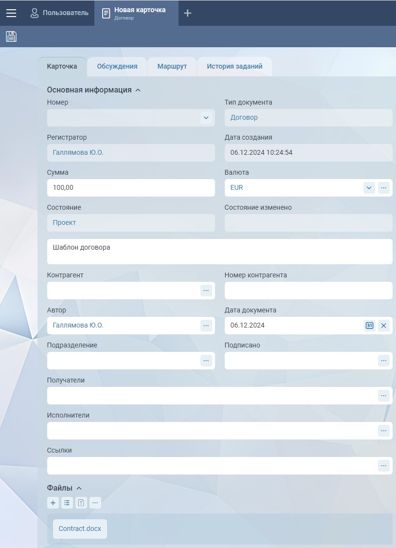 string, здесь можно переопределить имя файла (в т. ч. с использованием плейсхолдеров), если не задано, то будет использовано имя файла из шаблона. - Категория файла — ссылочное поле с автодополнением, значение из справочника Категории файлов, задаёт категорию файла, в которую будет добавлен файл в карточке документа.