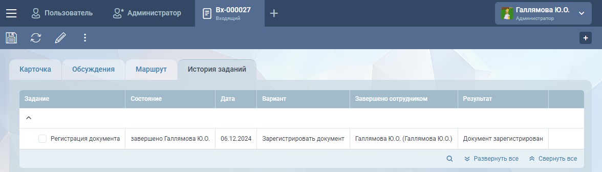 Создать новую группу, которая будет использоваться для формирования истории заданий можно кнопкой + Создать из рабочего места Администратор в представлении Документы и задания -> Типы групп истории заданий.