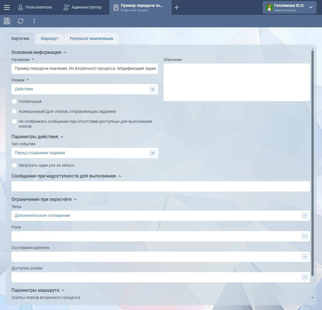 - С помощью подсистемы маршрутов есть возможность выполнять различные действия или проверки при сохранении карточки, выполнении задания и т.п.