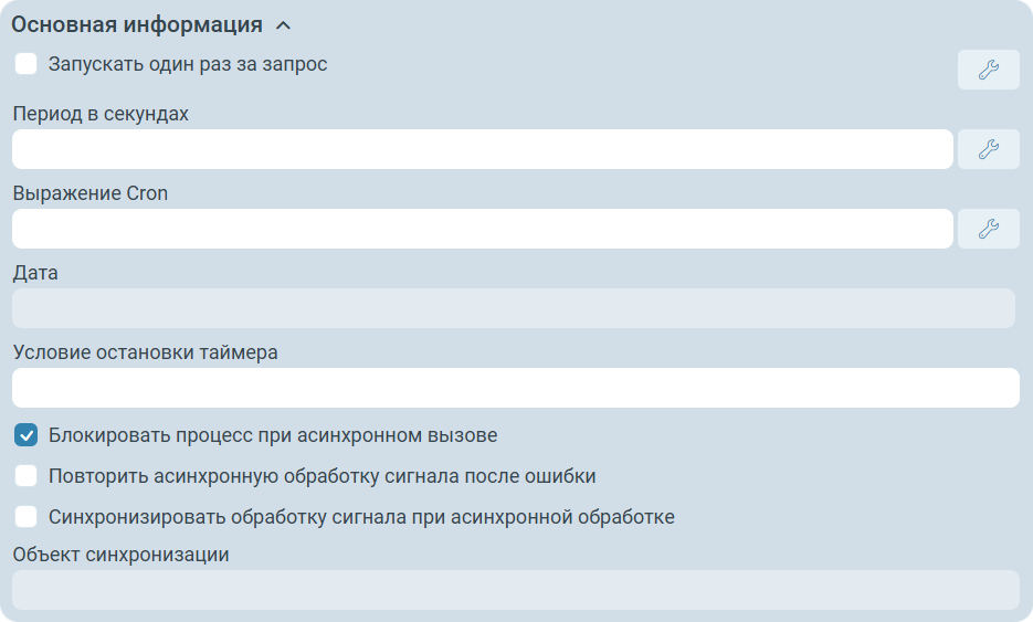 Объект синхронизации - определяет ключ, по которому будет выполняться синхронизация асинхронной обработки сигнала. Доступен для редактирования только при установленном флаге Синхронизировать обработку сигнала при асинхронной обработке. По умолчанию в качестве ключа устанавливается значение