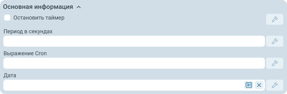 Дата - время выполнения таймера. Поле доступно только при установке флага Запускать один раз за запрос. Может быть привязано к параметрам процесса.