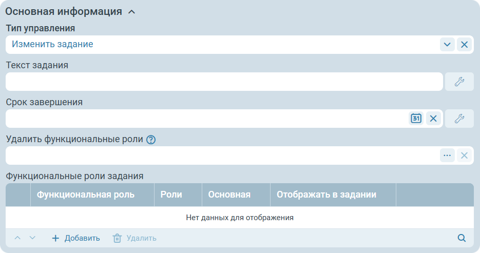 Удалить функциональные роли - список функциональных ролей, по которым будут удалены соответствующие записи из списка связанных с заданием ролей.