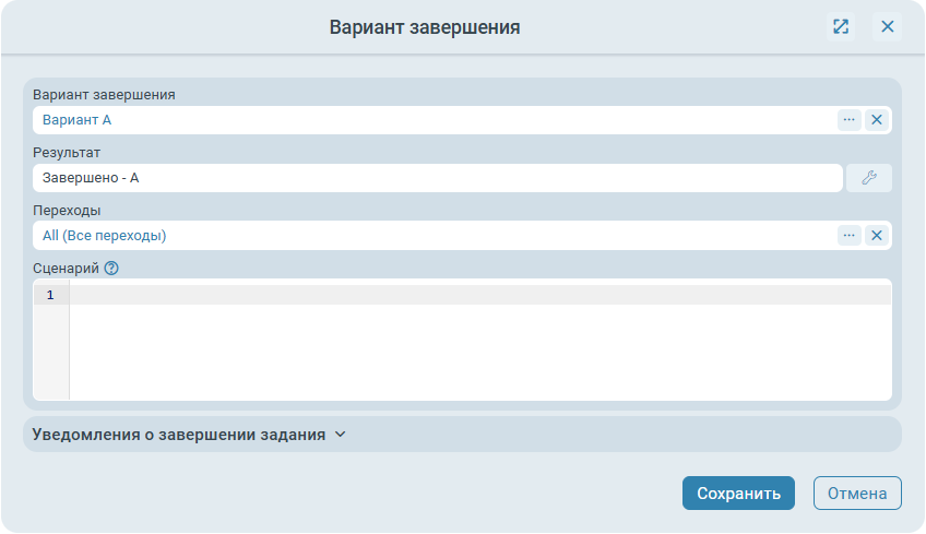 - Вариант завершения (значение из списка вариантов завершения, может быть привязано к параметрам процесса) - определяет вариант завершения, с которым будет завершено задание. Доступно только при типе управления Завершить задание.
