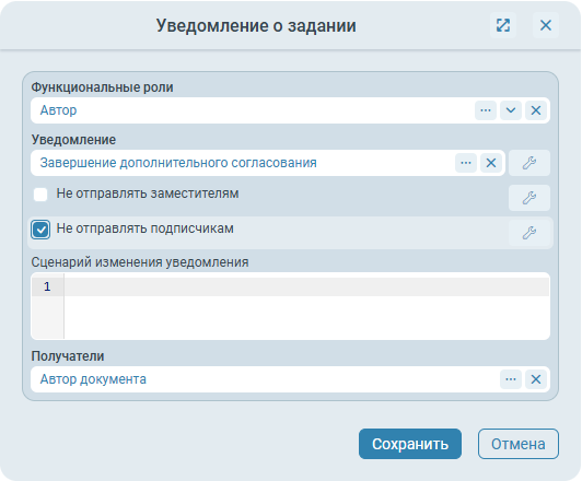 Не отправлять подписчикам - при формировании списка получателей уведомления не учитываются сотрудники, имеющие подписку на данный тип уведомления для обрабатываемой карточки. Может быть привязано к параметрам процесса.