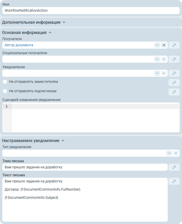 Действие узла Доработка, WorkflowTaskAction, настраивается таким образом: