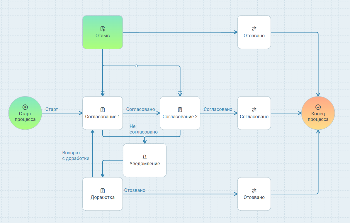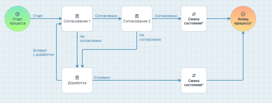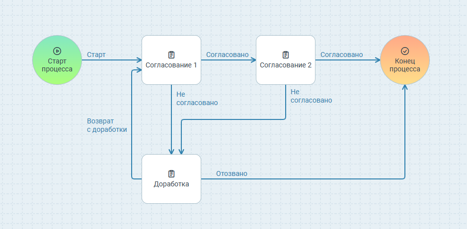 Это пример поэтапного создания процесса со своими настройками, где используется стандартное действие Задание. Однако для заданий согласования и доработки удобно использовать соответствующие действия из группы Маршруты, т.к. в них уже заложено много функциональности, например, запрос дополнительного согласования, делегирование и т.п.