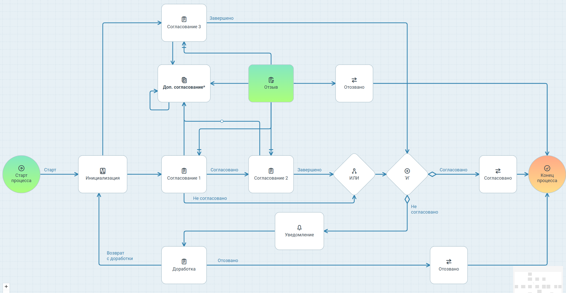 Отозвать- переход в узел Конец процесса.