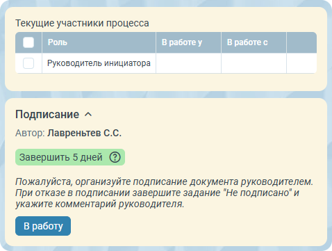 Когда задание у сотрудника на подписании, он может сделать всё, что предусмотрено возможностями этапа подписания: подписать и отказать в подписании, запросить дополнительные комментарии или делегировать задание. После подписания процесс перейдёт к следующему этапу.