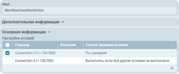 Для организации ветвления процесса, в зависимости от суммы договора, в процессе присутствует действие типа Условие имеющее два условия перехода: