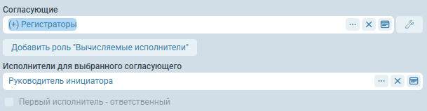 Добавить роль “Вычисляемые исполнители” - добавляет роль “Вычисляемые исполнители” в список согласующих. На это место будут подставлены согласующие, вычисленные с помощью скрипта из поля SQL исполнители. По умолчанию вычисляемые исполнители будут добавлены в конец списка согласующих.