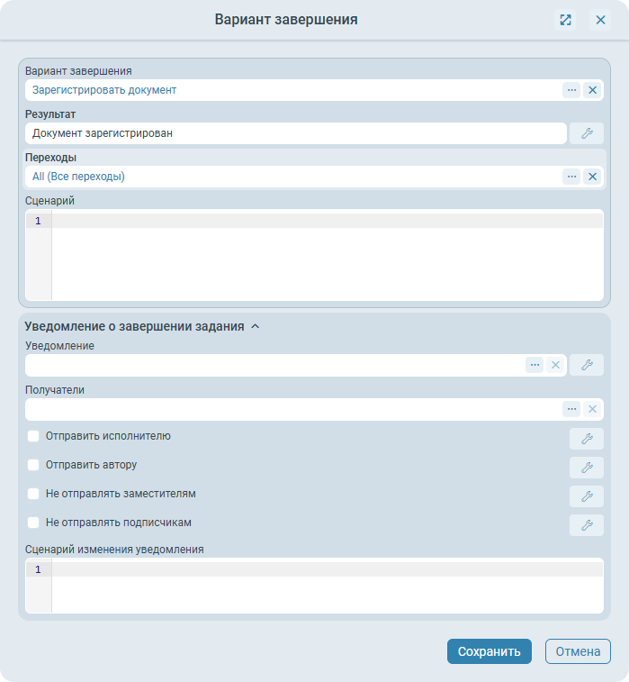 Сценарий изменения уведомления - скрипт модификации уведомления. В нем можно изменить шаблон отправляемого уведомления, приложить файлы к уведомлению, а также передать делегаты для модификации письма для конкретного получателя. Может быть привязано к параметрам процесса.