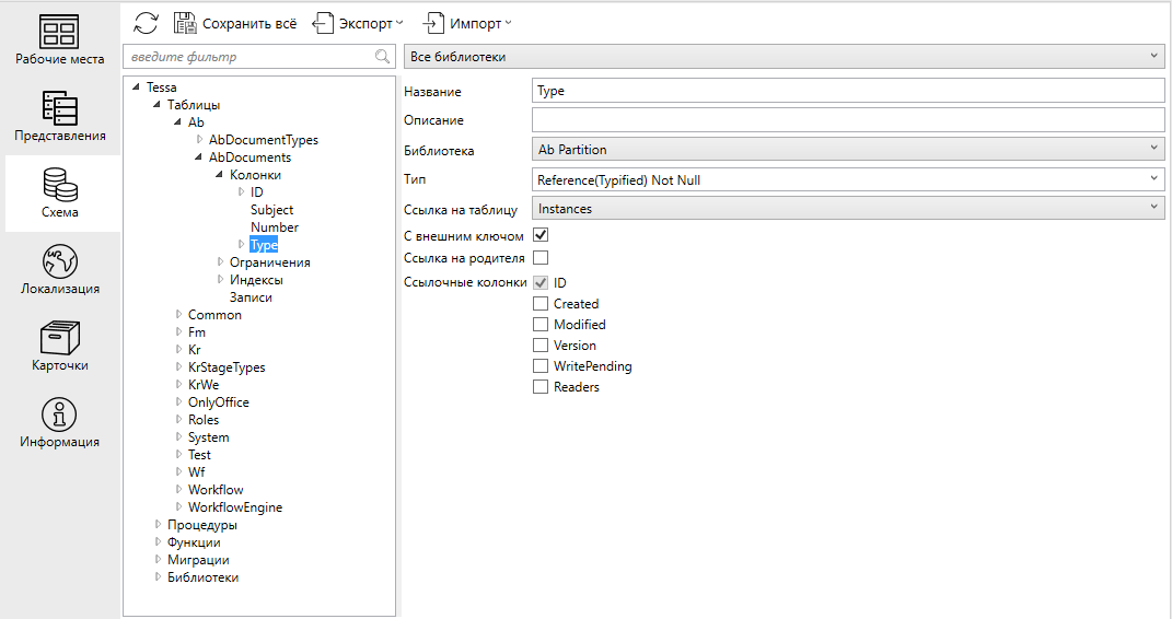 AbDocumentTypesв поле Ссылка на таблицу, т.е. указать, что колонка Type содержит ссылку на таблицуAbDocumentTypes. Первичным ключом этой таблицы является колонкаID, поэтому в узел колонки “Type” была автоматически добавлена колонка “TypeID”. Физически в БД для таблицы будет создана именно колонка TypeID, в то время как колонкаTypeопределена в метаинформации схемы данных для использования в платформе.Example