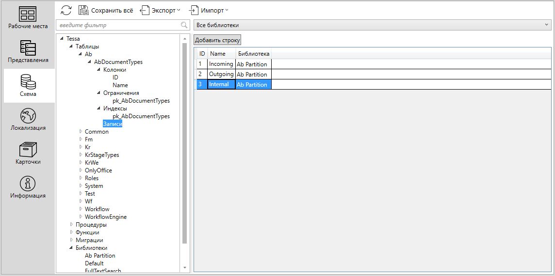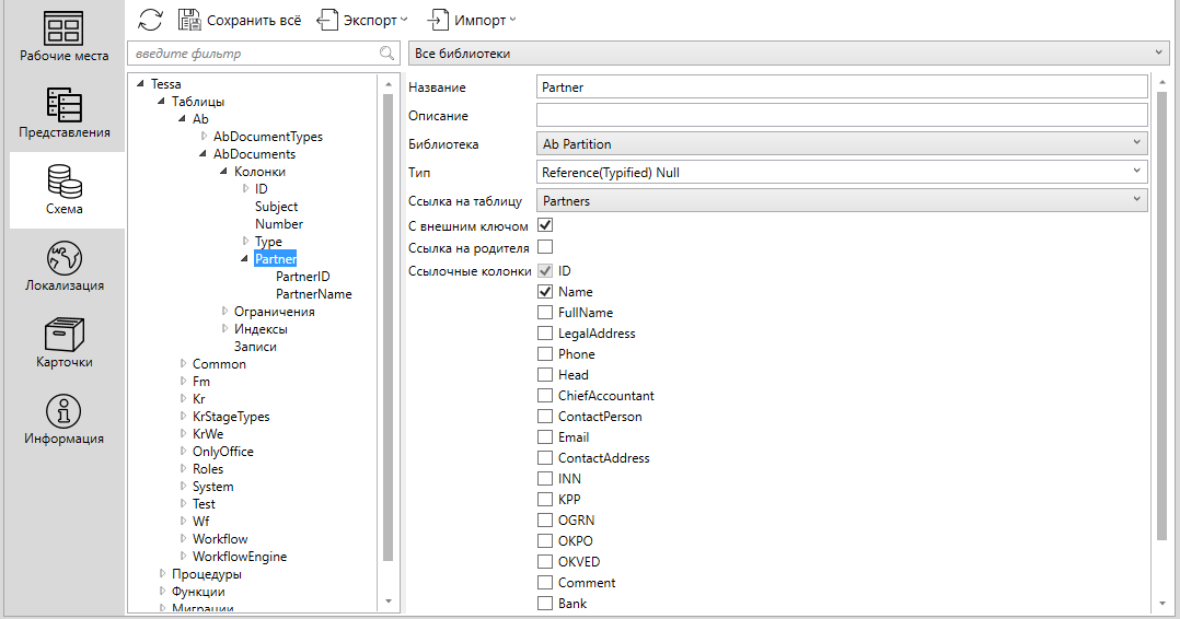 После произведенных настроек необходимо сохранить схему сочитанием клавиш Ctrl+S. Все созданные объекты в схеме данных сохранены в отдельной библиотеке - Ab Partition. Более подробно об использовании библиотек, экспорте и импорте схемы данных/библиотек можно прочитать в Руководстве Администратора.