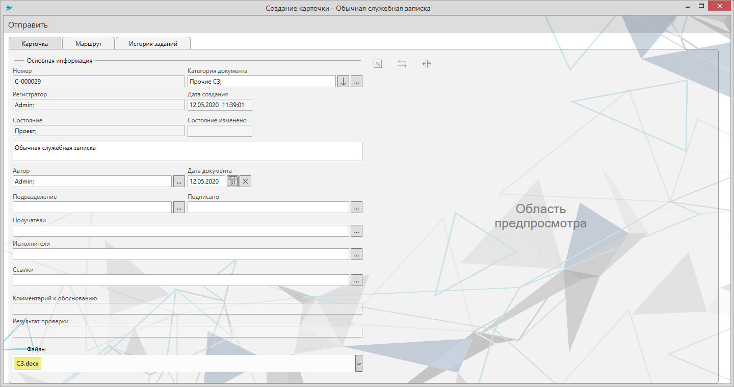 Давайте создадим новую обычную служебную записку и очистим поле “Категория документа”. Выделите значение и удалите его, после чего отправьте документ на согласование.