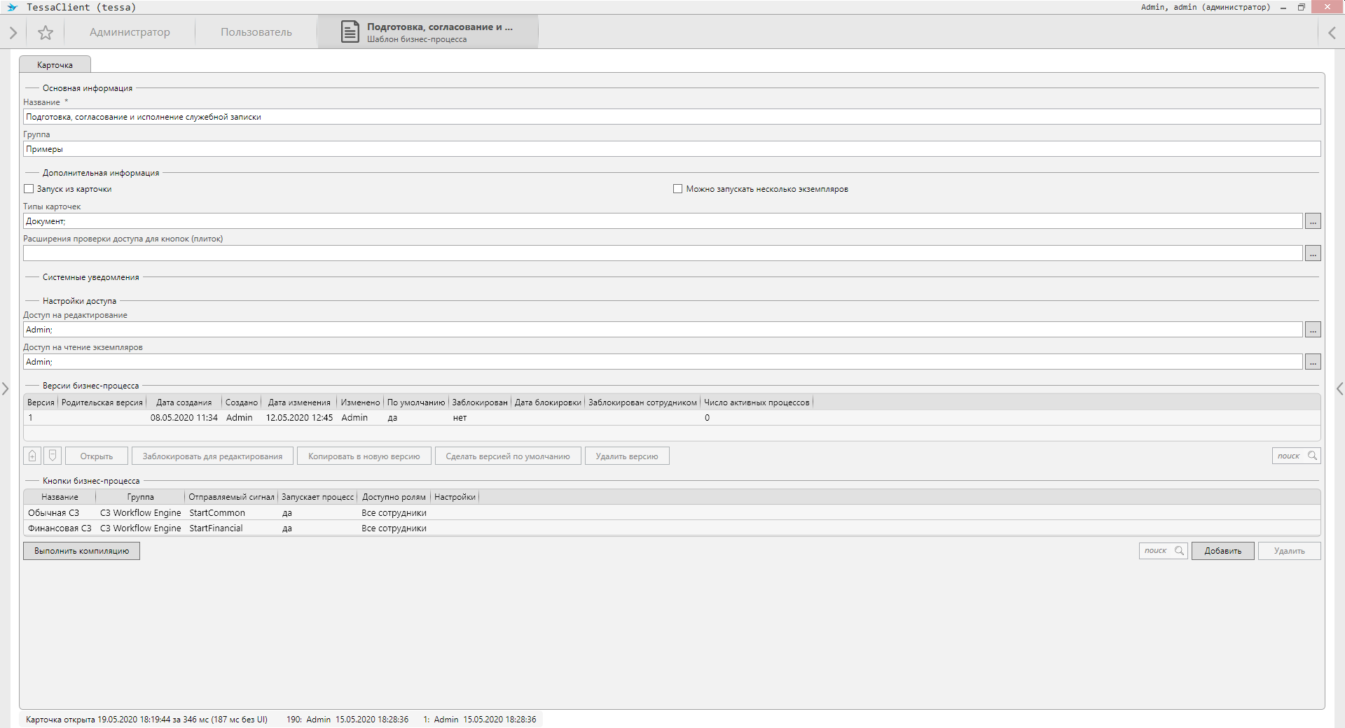 Посмотрим, как выглядит процесс. Для этого откроем редактор экземпляра процесса Левое меню → Действия → Процессы → Подготовка, согласование и исполнение служебной записки/заявки. В настоящий момент активно действие “Исполнение обычной СЗ”.
