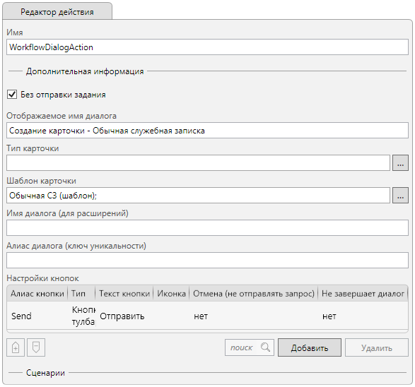 Обратите внимание на установленный флаг Без отправки задания. Он позволяет использовать диалог в глобальных процессах, т.е. без использования карточки.
