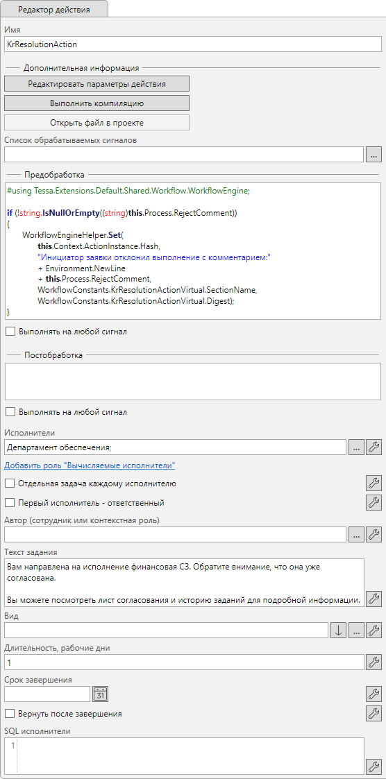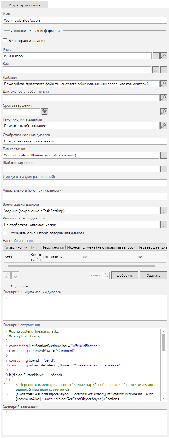 Для реализации создания карточки по шаблону и открытию её в диалоговом окне используется действие “Диалог” расположенное в узлах “Инициализация финансовой СЗ” и “Инициализация обычной СЗ”.