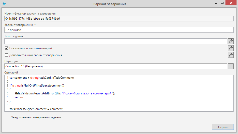 Давайте не примем выполнение. Нажмите кнопку “Не принято”, заполните комментарий и еще раз нажмите “Не принято” для подтверждения завершения.