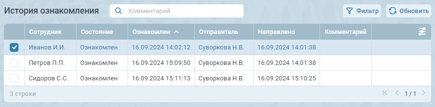 В новой вкладке будет открыта история ознакомления с данным документом с указанием информации по дате и времени отправки на ознакомление, а также времени, когда сотрудник был ознакомлен с документом.