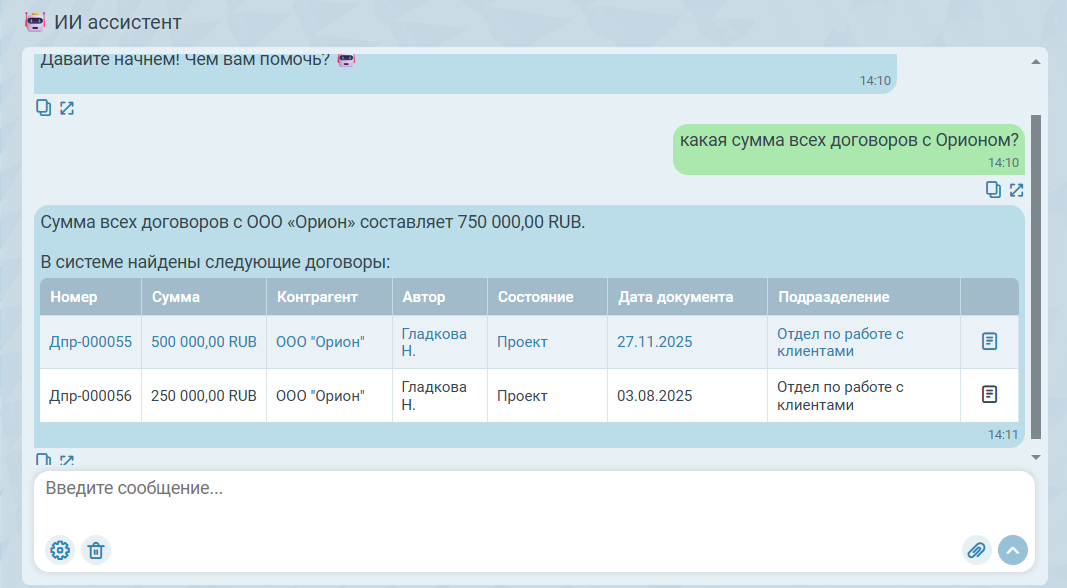 При помощи ИИ ассистента можно получить разную информацию о договорах в системе: узнать актуальное состояние договора, вывести список всех договоров с определённым контрагентом, посчитать общую сумму договоров за указанный период и т.д. Для этого нужно сформулировать в чате соответствующий запрос.