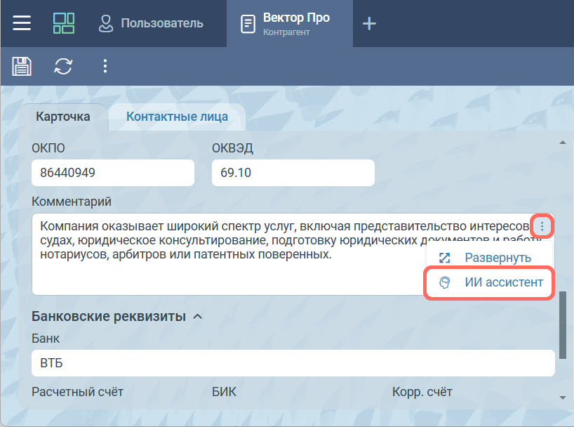 Чтобы воспользоваться инструментом, нужно выбрать пункт ИИ ассистент в контекстном меню, кнопка вызова контекстного меню появляется при наведении указателя мыши на текстовое поле.