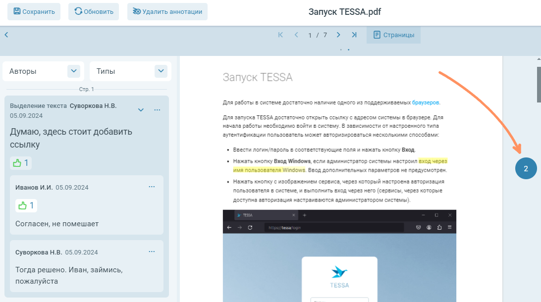 Для сохранения изменений нужно нажать на кнопку Сохранить в левом верхнем углу диалога. Если аннотации добавляют несколько человек параллельно, то, чтобы увидеть эти изменения у себя, нужно нажать на кнопку Обновить. После этого аннотации других сотрудников появятся в диалоге.