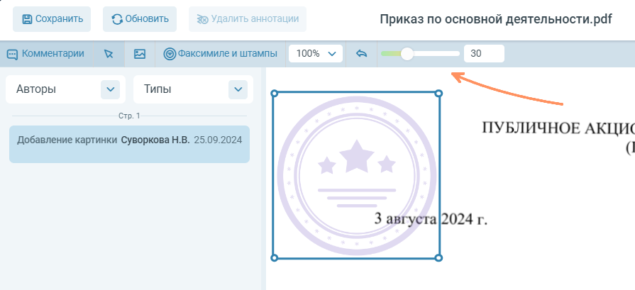 В отличие от аннотаций, факсимиле и штампы после добавления и сохранения нельзя будет удалить или переместить.