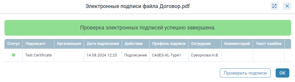 Подпись будет проверяться для последней актуальной версии файла. В открывшемся окне будет отображен результат проверки.