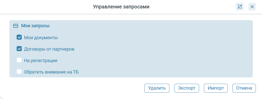 - Импорт запроса. При нажатии кнопки Импорт появится окно для выбора файла запроса. Выбранные файлы добавятся в список Мои запросы и будут доступны для использования.