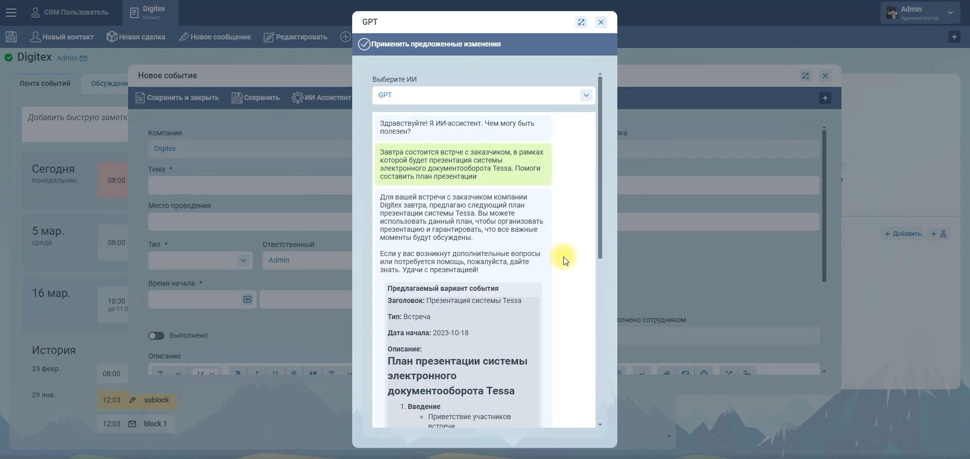 Благодаря технологиям обработки естественного языка (NLP), которые применены в модуле, для любого действия в TESSA пользователю достаточно сформулировать запрос в свободной форме. ИИ-ассистент доступен как в карточке, так и на панели настраиваемого виджета — это позволяет быстро ввести свой запрос и получить необходимую информацию, не прерывая работу в СЭД и не переходя в сторонние приложения.