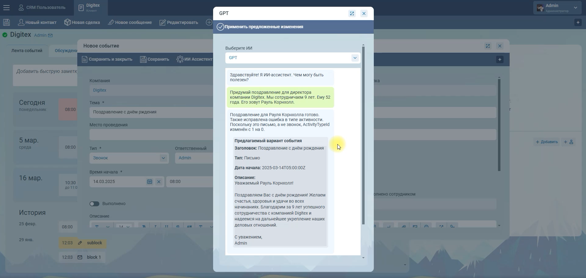 Часто бывает так, что нужно быстро составить текст приглашения на мероприятие сотрудников или отправить поздравление деловому партнеру. В этом случае ИИ-ассистент может взять на себя функцию копирайтера — пользователю достаточно выбрать требуемый стиль и формат письма, указав конкретные детали.