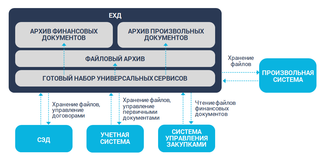 Модуль позволяет внешним системам управлять хранением файлов и документов (метаданные и ссылки на файлы), а также предоставлять доступ другим информационным системам к данным в ЕХД. Через набор REST-сервисов решение легко интегрируется с информационными системами организации — СЭД, ERP, MDM, CRM, КЭДО — с возможностью гибкого разграничения прав доступа