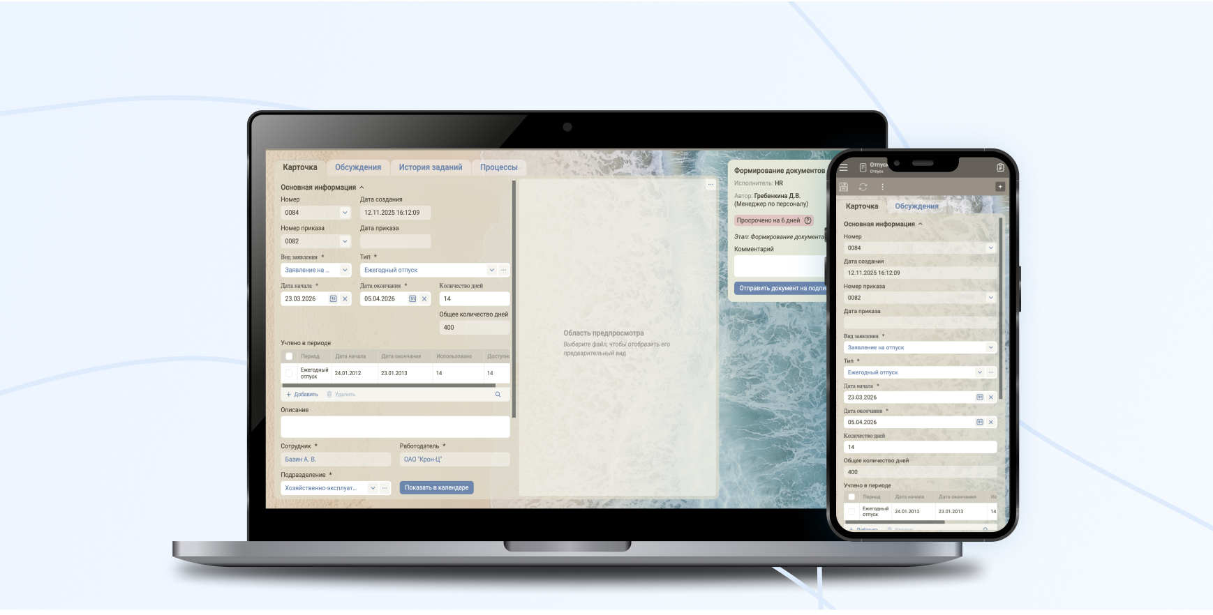 Отправка заявлений на отпуск (плановый или внеплановый), быстрое согласование и оформление приказа.