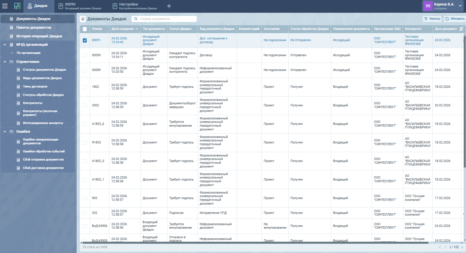 • Наличие набора справочников, необходимых для документов Диадок