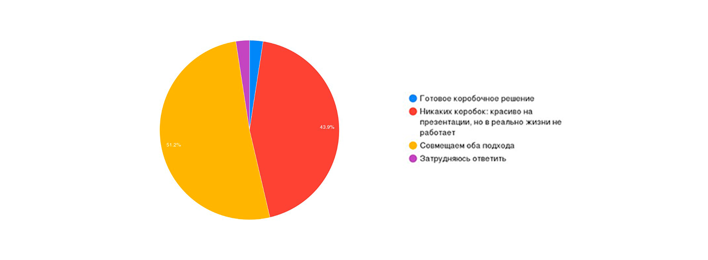 Согласно аналитике, проведенной в рамках онлайн-трансляции, 43,9% считают, что готовые решения красиво смотрятся в презентации, но реальной в жизни не работают, а 51,2% совмещают в своей работе оба подхода. А что говорят эксперты?