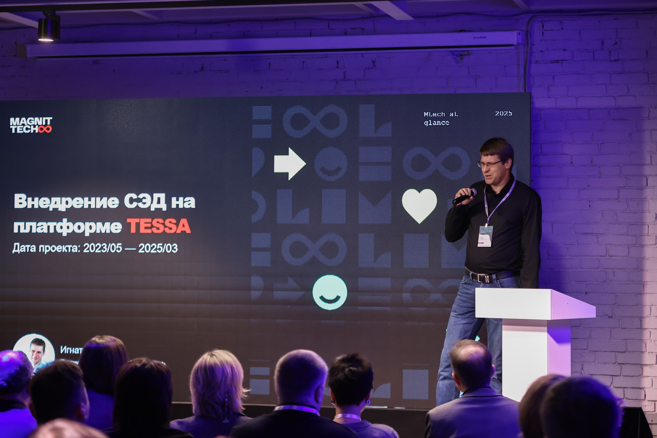 Игнат Авдеев, руководитель проекта компании Magnit Tech, рассказал о масштабном проекте внедрения TESSA в «Магните». Среди основных целей — импортозамещение, отказ от бумаги и автоматизация процессов. Игнат подчеркнул, что одним из решающих факторов выбора платформы стала её исключительная производительность, подтверждённая нагрузочным тестированием — TESSA способна стабильно обрабатывать до полумиллиона документов в час и сохранять быстродействие в условиях пиковой нагрузки, равнозначной двухгодичному объему документов.
