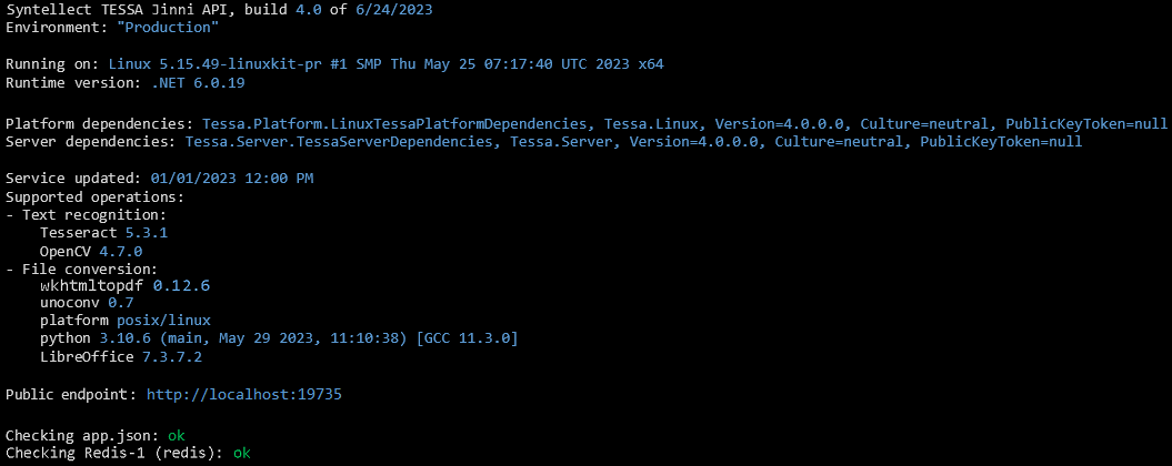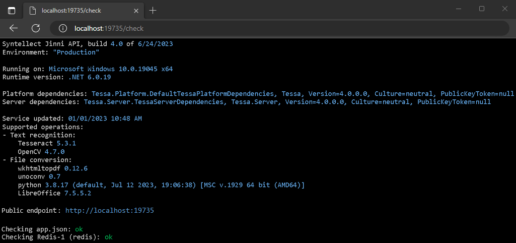 На машине, где установлен веб-сервис, или из любого другого компонента системы (например, Chronos или веб-сервис TESSA) выполните запрос по адресу http://localhost:19735/check.
