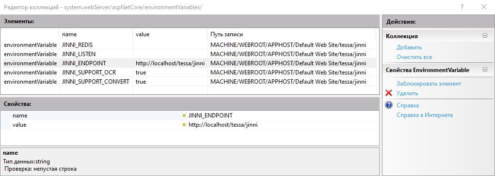 В качестве альтернативного варианта установки переменных окружения можно воспользоваться диспетчером служб IIS. Для этого на уровне приложения jinni в разделе Редактирование конфигураций нужно выбрать параметр system.webbServer/aspNetCore. В поле environmentVariables нажать на кнопку с изображением трех точек: